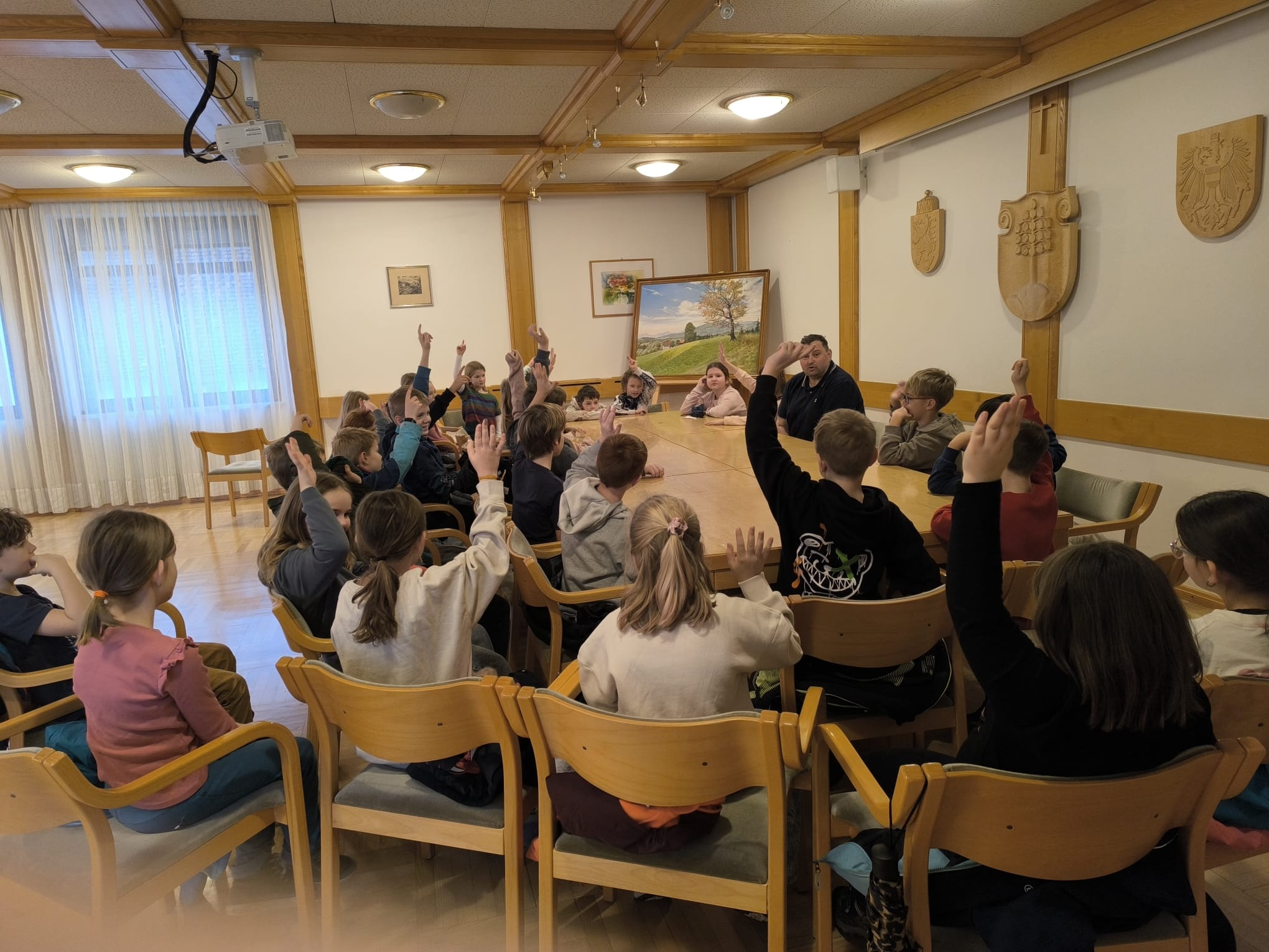 Die Schüler:innen der 3. Klassen besuchten im Rahmen eines Lehrausgangs den Bürgermeister Hannes Grabner im Gemeindeamt. Dabei wurde viel erzählt, gefragt und beantwortet. Herr Grabner nahm sich Zeit, erklärte seine Aufgaben und gab spannende Einblicke in die Arbeit der Gemeinde.